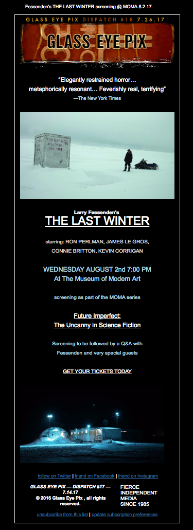 Glass Eye Pix is the fierce independent NYC-based production outfit headed by award-winning art-horror auteur Larry Fessenden with the mission of supporting individual voices in the arts.