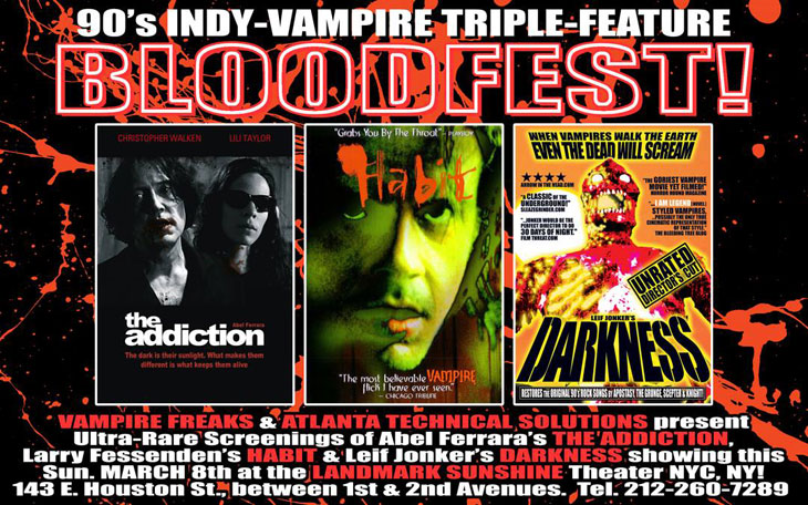The triptych, presented by Vampire Freaks and Atlanta Technical Solutions, takes place this Sunday, March 8 at 7 p.m. at the Sunshine (143 East Houston Street between 1st and 2nd Avenues). Leading off is Abel Ferrara’s moody black-and-white THE ADDICTION, starring Lili Taylor and Christopher Walken, which remains unavailable on U.S. disc, followed by Larry Fessenden’s HABIT (pictured above) in a brand new restored cut, and finished off with Leif Jonker’s underground splatterfest DARKNESS in its rarely seen alternate “Metal Cut.” Following the movies, there will be a Skype Q&A with filmmakers and critics—and if you want to make it a bloodsucker quadruple feature, the hilarious mockumentary WHAT WE DO IN THE SHADOWS is also playing a regular engagement at the Sunshine!