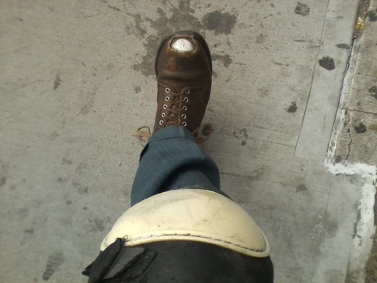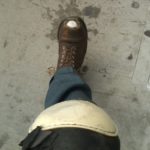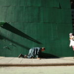 My crawling form must make me look like I don’t need help. I take a break on my knees and trade a nod with Teddy, then I keep going. I look down, 18 inches or so below. It’s like a view from a plane as I pass over black smears of dry gum, tiny lakes of spit, cigarette butts, and wide prisitne plains of smooth cement.