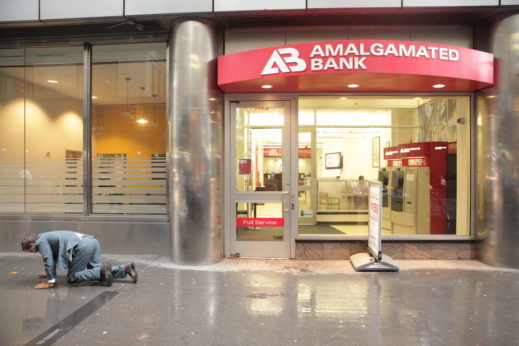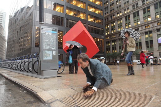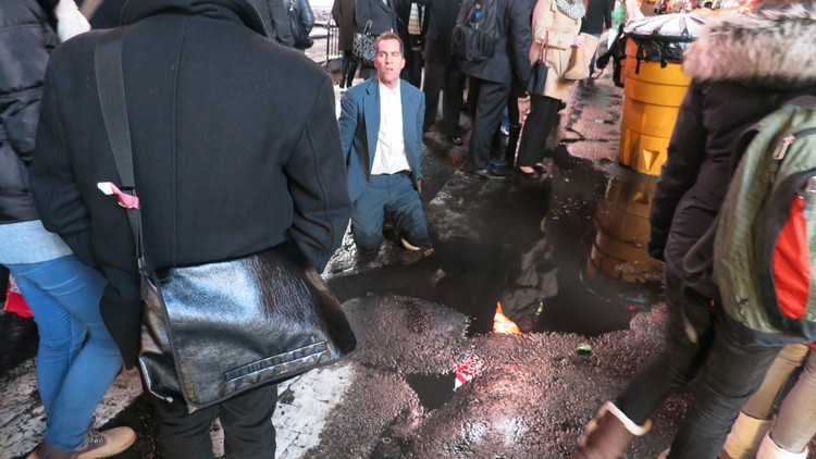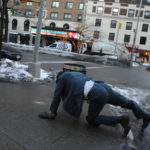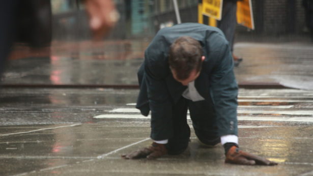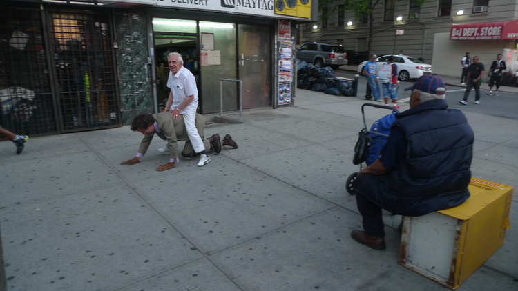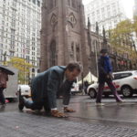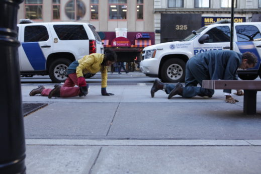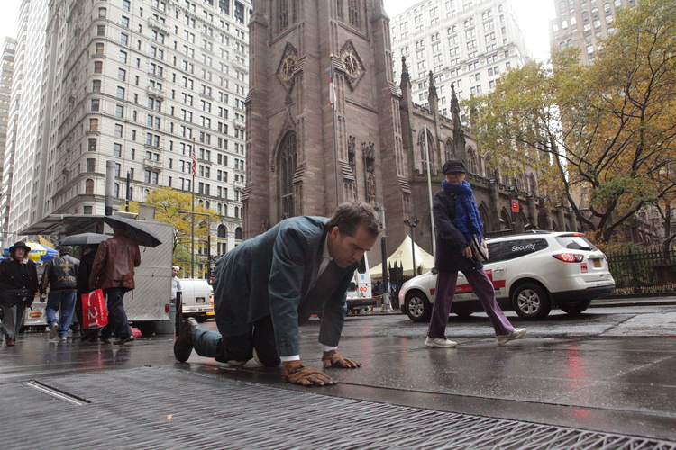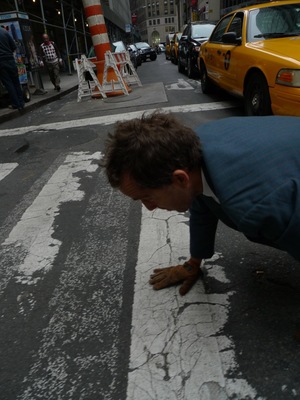 People are starting to get out for lunch and fill the sidewalks. I take a breath and take a look up at the overcast sky. Deep in the financial district. I get down on my hands and knees and nod to the earth beneath me. I start to crawl.