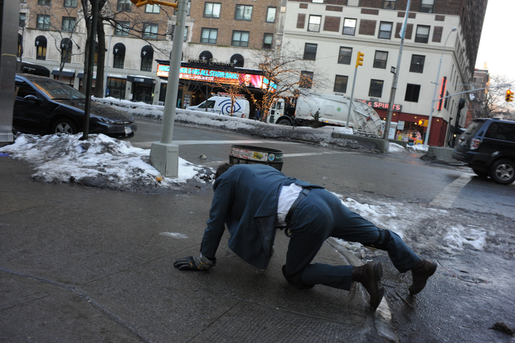 I imagine if you don’t live in Manhattan crawling up Broadway could seem sort of self destructive It’s true, I could get vomited on, or kicked in the face, or spit on. An insane homeless man limps by me now with bare torn up feet, muttering to himself, stabbing at the air with his hand. He might jump on my back and try to ride me. I see construction workers who look sort of drunk on the sidewalk smoking and spitting and cat calling at passing women. What will they say when I crawl by?? Then again maybe the person who is dangerous is the one who is crawling.