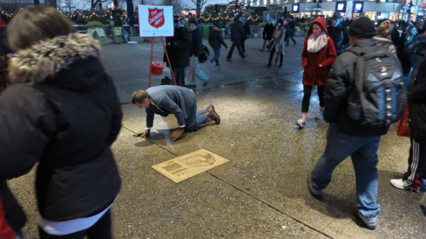 It is lonely down here on my hands and knees in the Canyon Of Heroes. Huge parades came through here. I wasn’t expecting to feel so lonely. Is this an act of desperation? There is desperation in the air. Does that make me desperate? Voices in my head told me to do this. Since when did voices in your head get such a bad rap? Maybe I’m praying. Maybe this is a meditation, or a migration. I am going home.