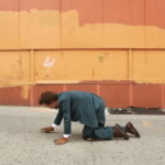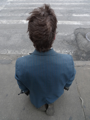 I can’t really see up ahead unless I stop and twist my neck. My wrists are going to be sore. I should be using my fist knuckle, like an ape. I can tell this flat palm method will strain my wrists. My kneepads are slipping and my knees are on their way to raw and I haven’t even crawled a full block. I try to concentrate on my pace and hug the right side of the sidewalk, out of the way of the main flow. Some pictures get taken. I feel like a dog and a clown and holy man.