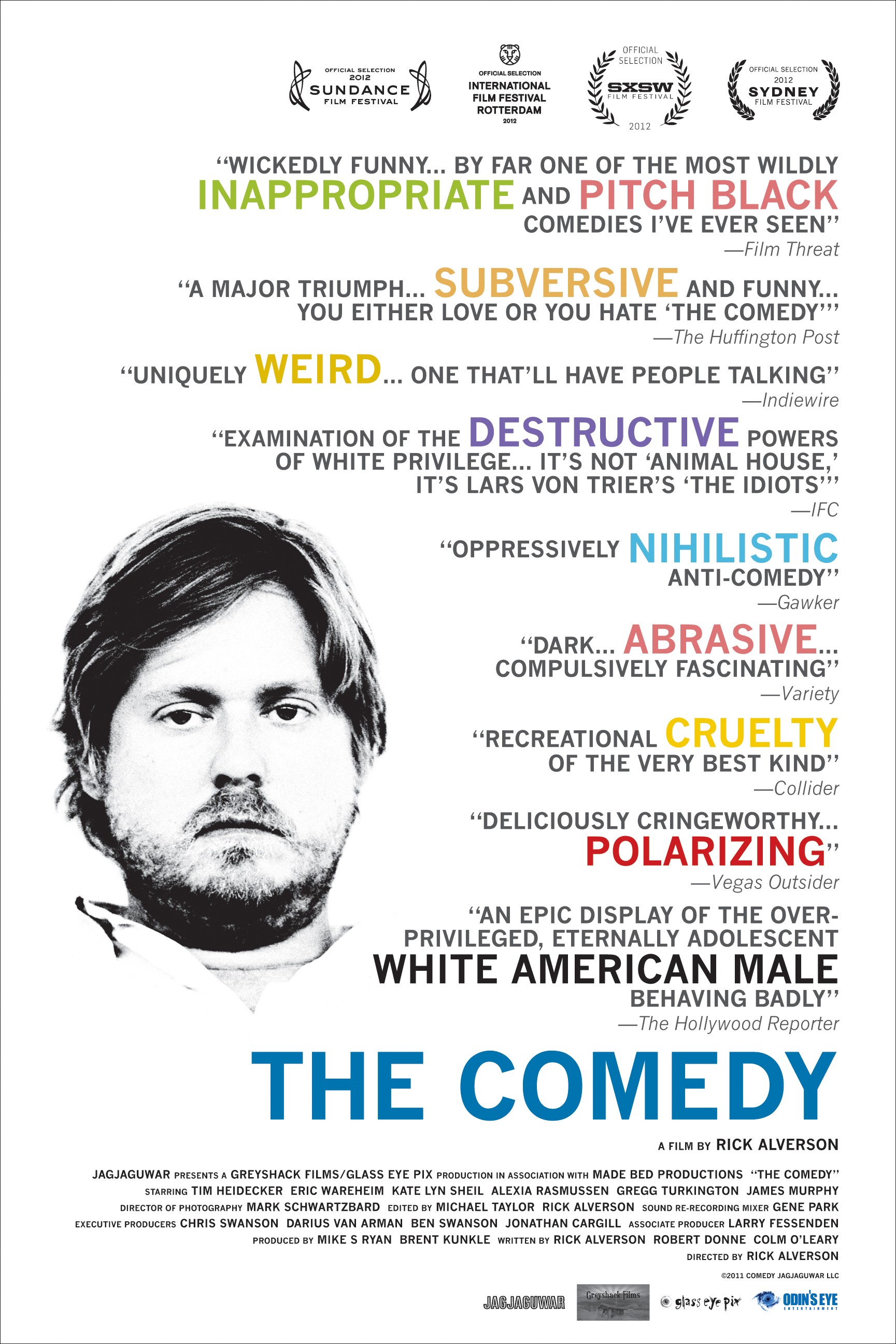 Could there be a more unsympathetic character in today’s culture than a well-born white male who uses his privilege irresponsibly? A highly improvised fictional exposé in search of the elusive heart and soul of hipster nihilism, The Comedy stars alt-comic superstar Tim Heidecker as Swanson, a trust fund 35-year-old hanging out in Williamsburg, fucking around, and waiting for his sickly dad to die.