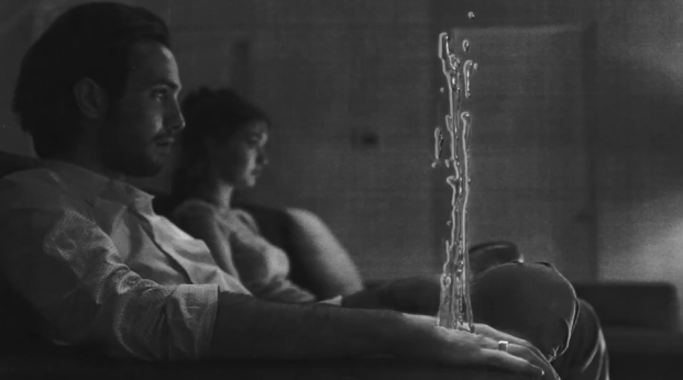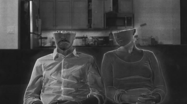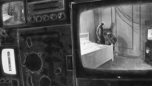 It’s the kind of short film that sucks you in just with the visual language. Siewert’s film is black-and-white and uses pen and charcoal drawings that create hypnotic images. Geoff Saba’s score is a nearly constant drone that perfectly complements the synthetic reality Siewert has on display. One moment that sums up the theme of the film is the image of the couple sitting on the bed naked while the word “DISCONNECT” can be seen on the TV screen behind them. Once they plug themselves in, the transmission takes effect and they become tuned into each other.