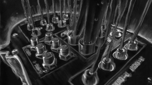 It’s hard for me to draw a straight line between any one source of inspiration and the final product. The kernel of the idea was just visualizing these bisected heads with analogue circuit boards in them.