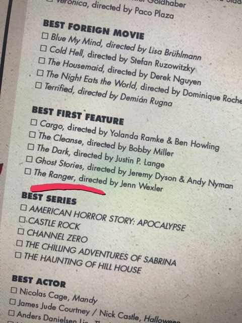 Jenn Wexler’s THE RANGER nominated for Best First Feature at the Fangoria Chainsaw Awards,